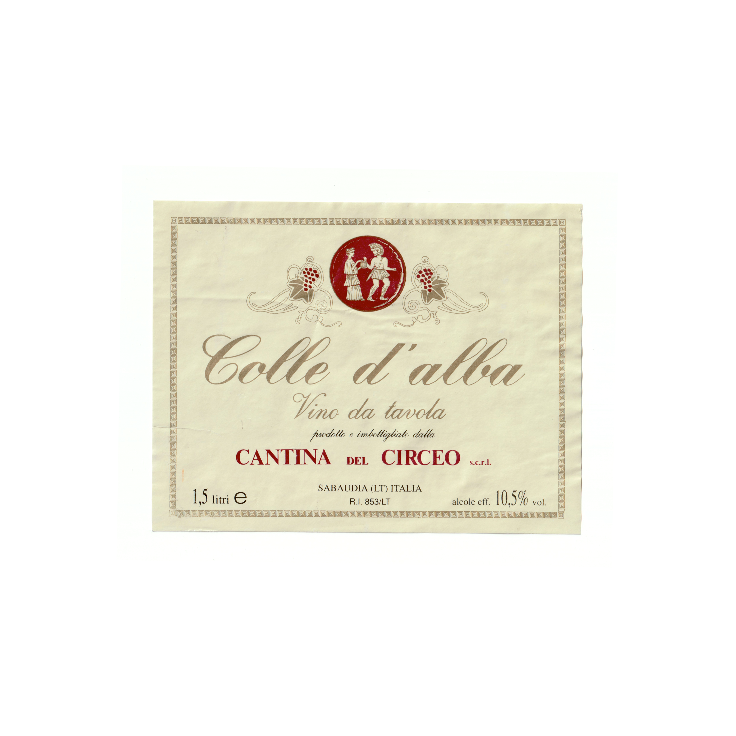 Il vino bianco Colle d’Alba, prodotto a Sabaudia, in Italia, presenta un’etichetta rettangolare realizzata in carta patinata lucida e stampata con tecnologia Offset.