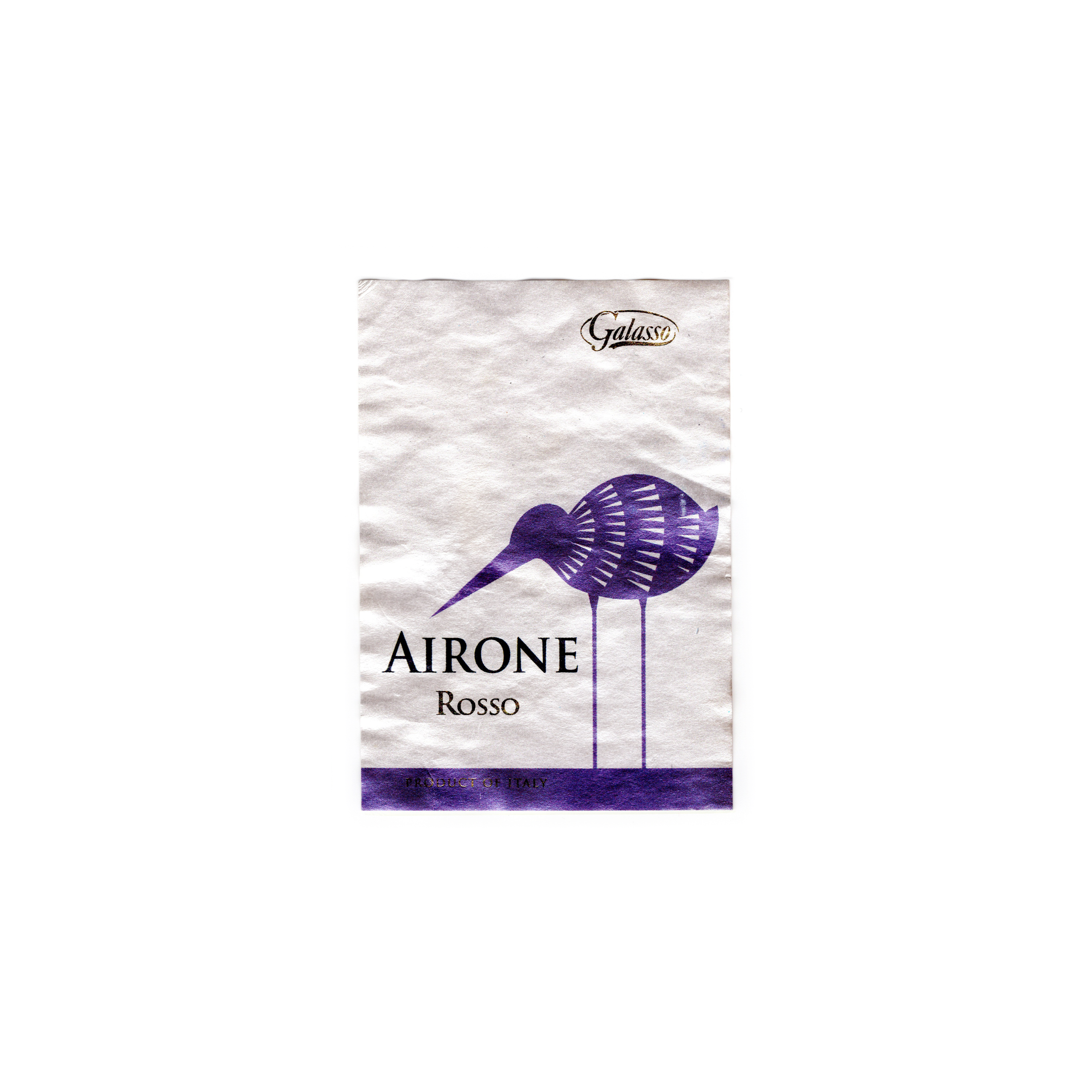 Il vino rosso Airone, prodotto a N/A, in Italia, presenta un’etichetta rettangolare realizzata in carta perlescente e stampata con tecnologia offset.