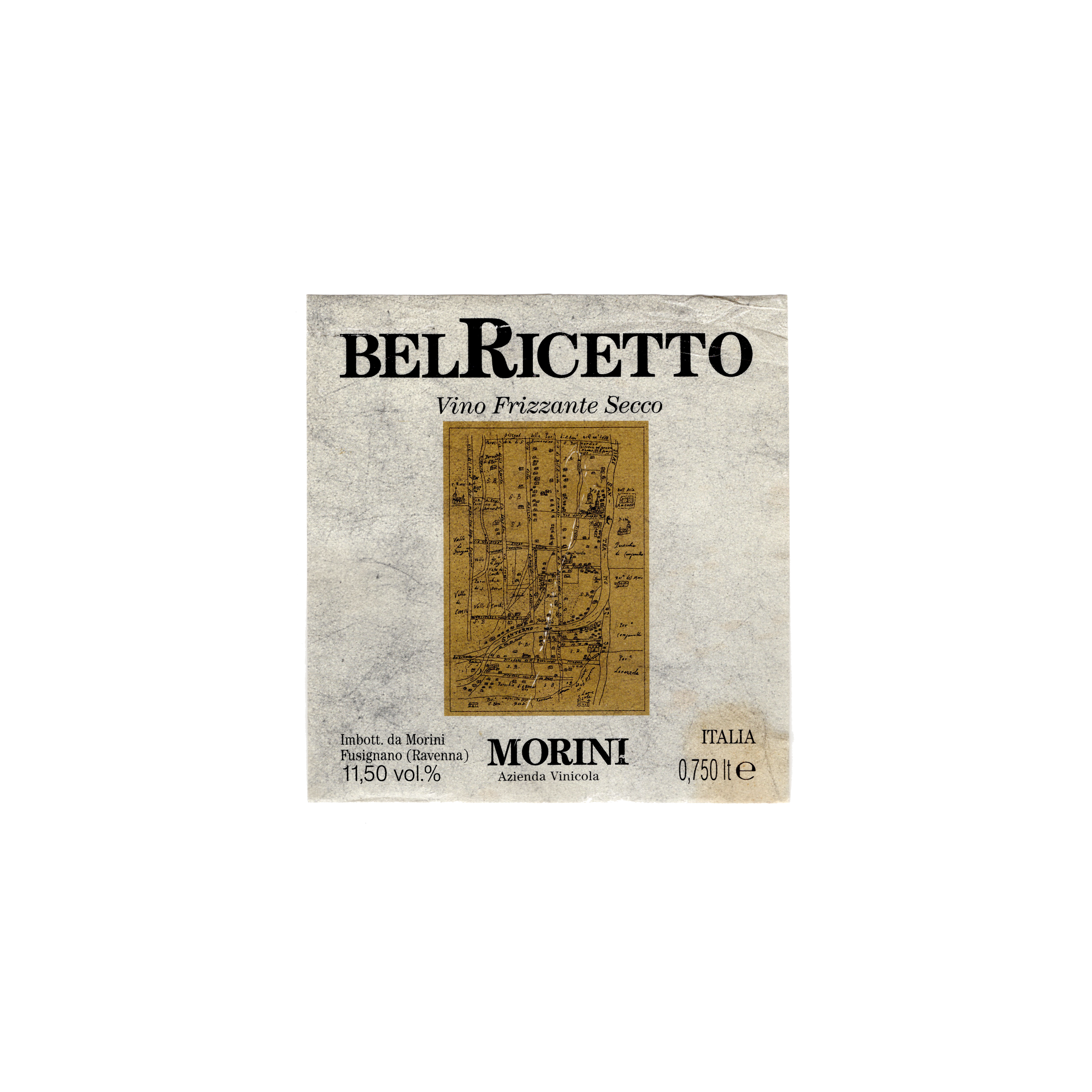 Il vino bianco BelRicetto, prodotto a Fusignano, in Italia, presenta un’etichetta rettangolare realizzata in carta patinata lucida e stampata con tecnologia offset.