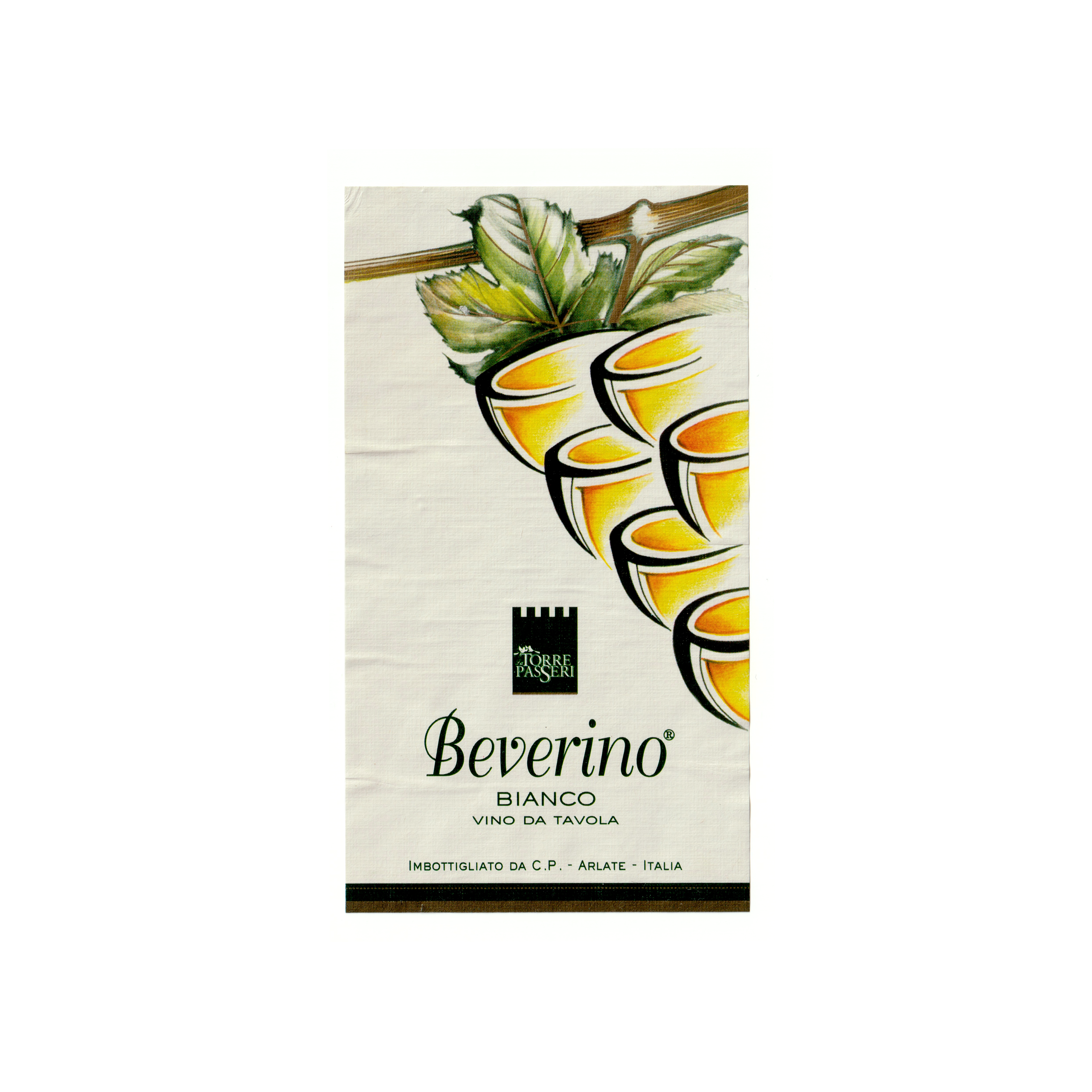 Il vino bianco Beverino, prodotto a Arlate, in Italia, presenta un’etichetta rettangolare realizzata in carta marcata e stampata con tecnologia Offset.
