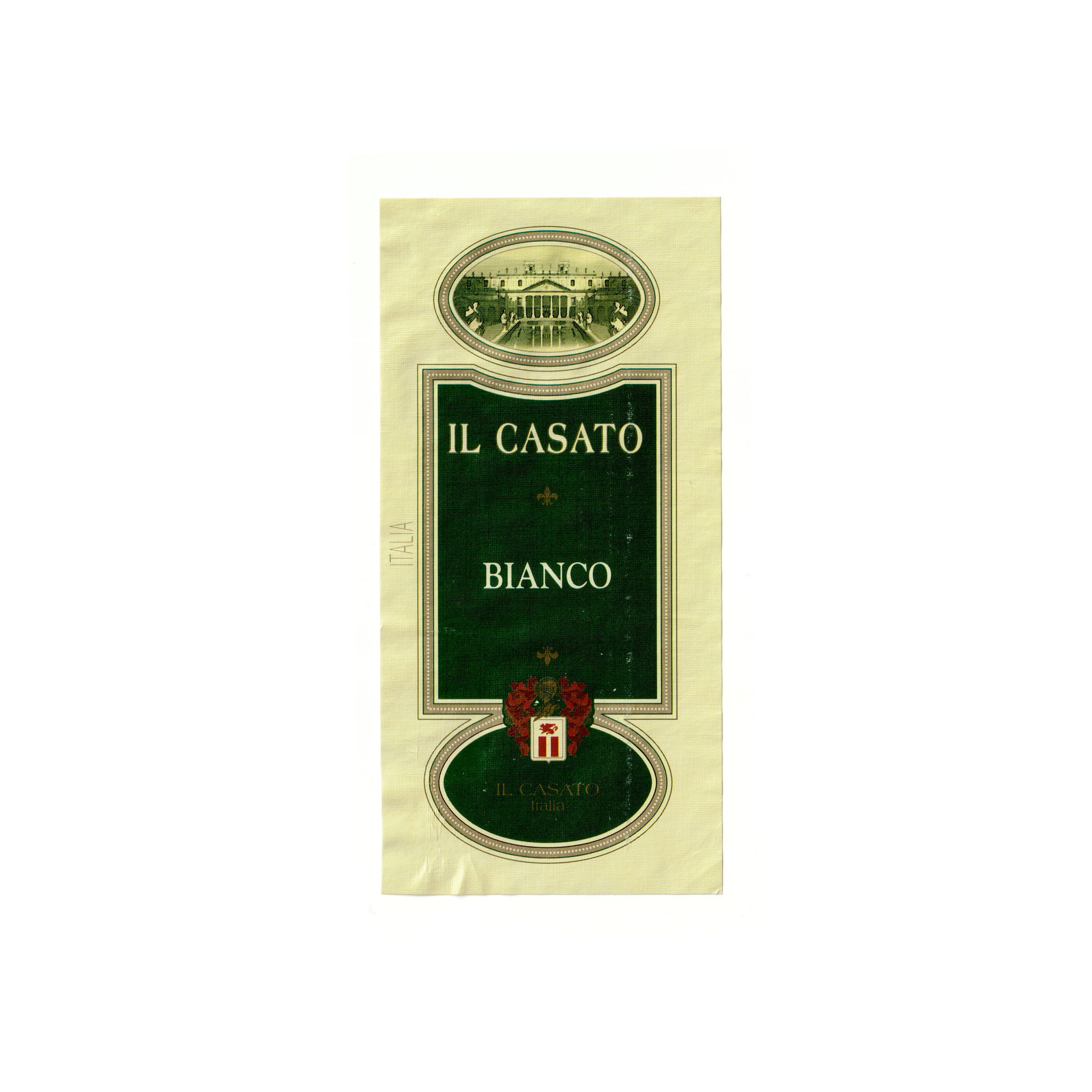 Il vino bianco Bianco, prodotto a Chiari, in Italia, presenta un’etichetta rettangolare realizzata in carta marcata e stampata con tecnologia Offset.