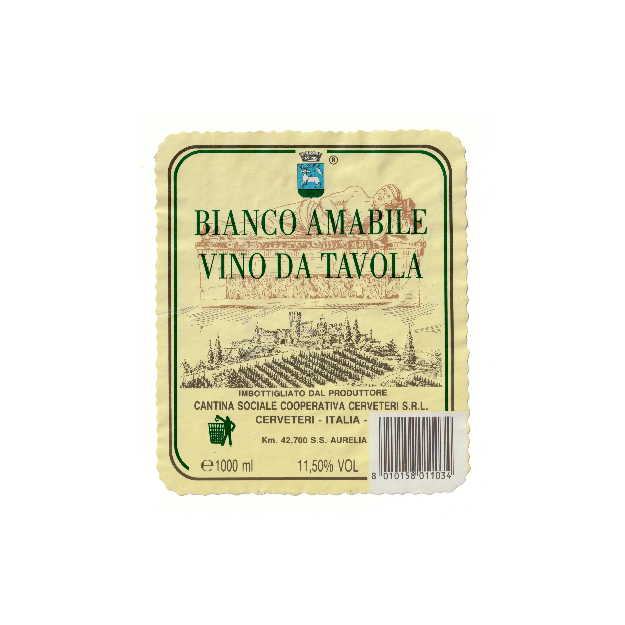 Il vino bianco Bianco Amabile, prodotto a Cerveteri, in Italia, presenta un’etichetta rettangolare realizzata in carta patinata lucida e stampata con tecnologia Offset.