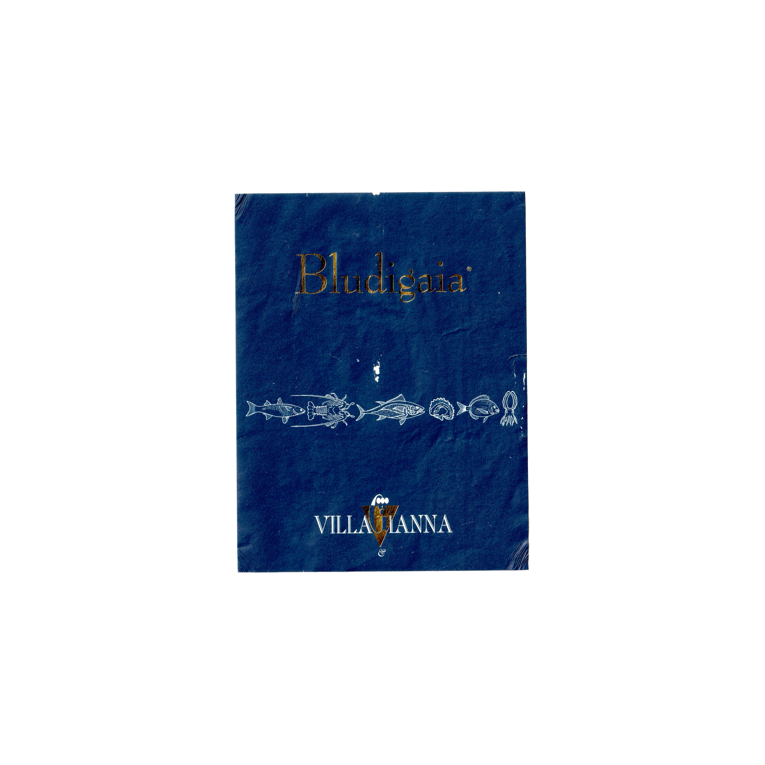 Il vino bianco Bludigaia, prodotto a Sabaudia, in Italia, presenta un’etichetta rettangolare realizzata in carta usomano e stampata con tecnologia offset.