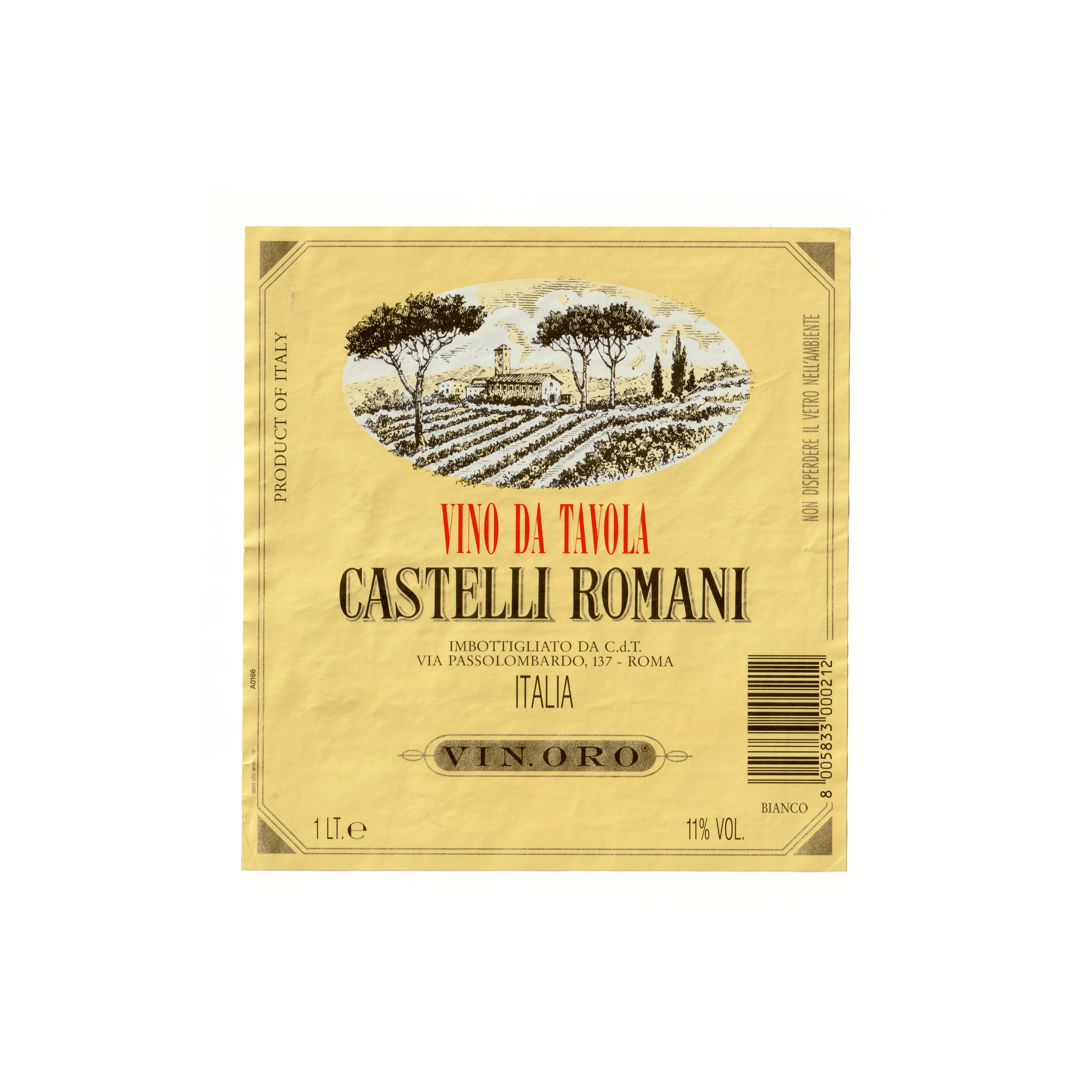 Il vino bianco Castelli Romani, prodotto a Roma, in Italia, presenta un’etichetta rettangolare realizzata in carta patinata lucida e stampata con tecnologia Offset.