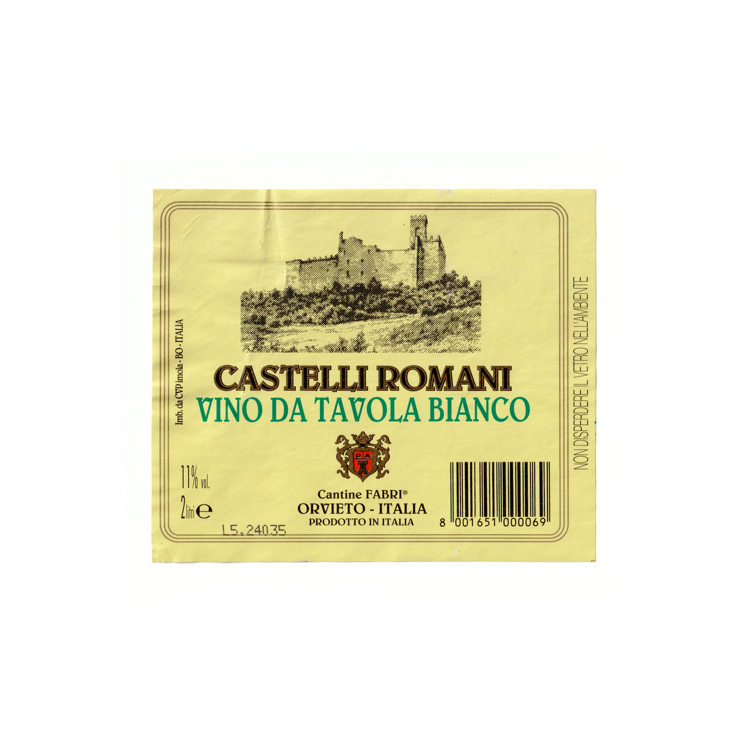 Il vino bianco Castelli Romani, prodotto a Orvieto, in Italia, presenta un’etichetta rettangolare realizzata in carta patinata opaca e stampata con tecnologia Offset.