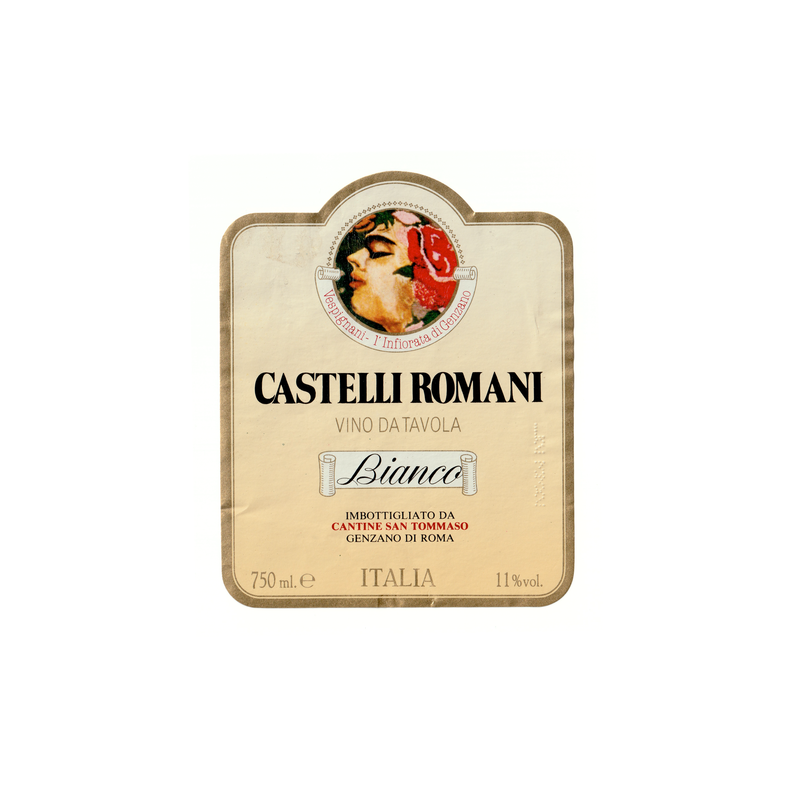 Il vino bianco Castelli Romani, prodotto a Genzano di Roma, in Italia, presenta un’etichetta altro realizzata in carta patinata lucida e stampata con tecnologia Offset.