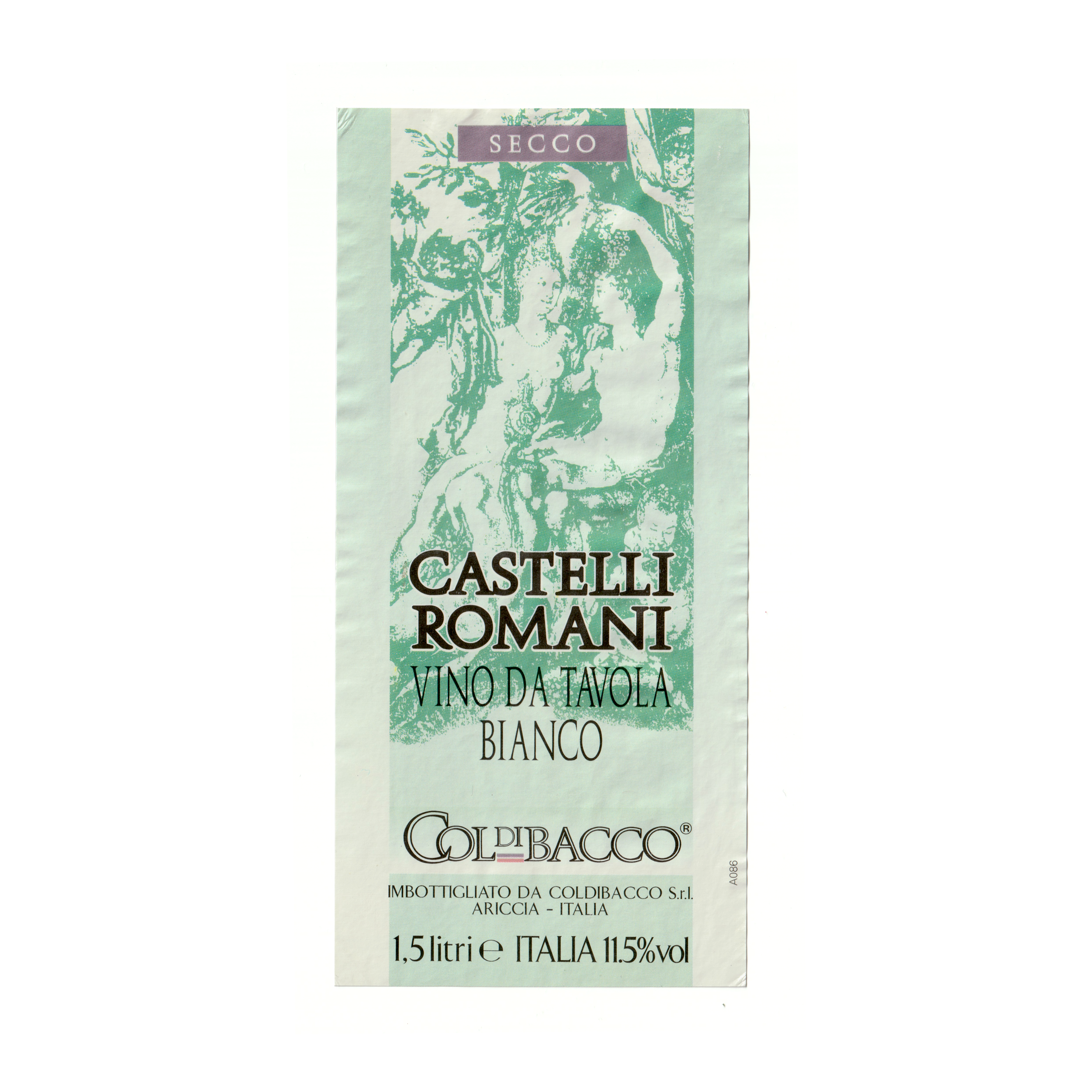 Il vino bianco Castelli Romani – Secco, prodotto a Ariccia, in Italia, presenta un’etichetta rettangolare realizzata in carta patinata lucida e stampata con tecnologia offset.