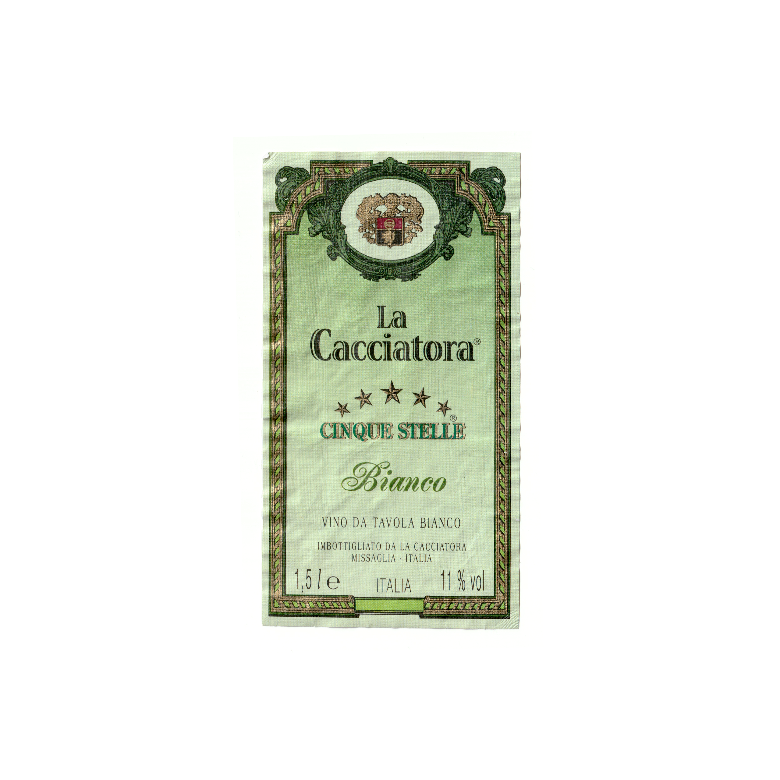 Il vino bianco Cinque Stelle Bianco, prodotto a Missaglia, in Italia, presenta un’etichetta rettangolare realizzata in carta marcata e stampata con tecnologia Offset.
