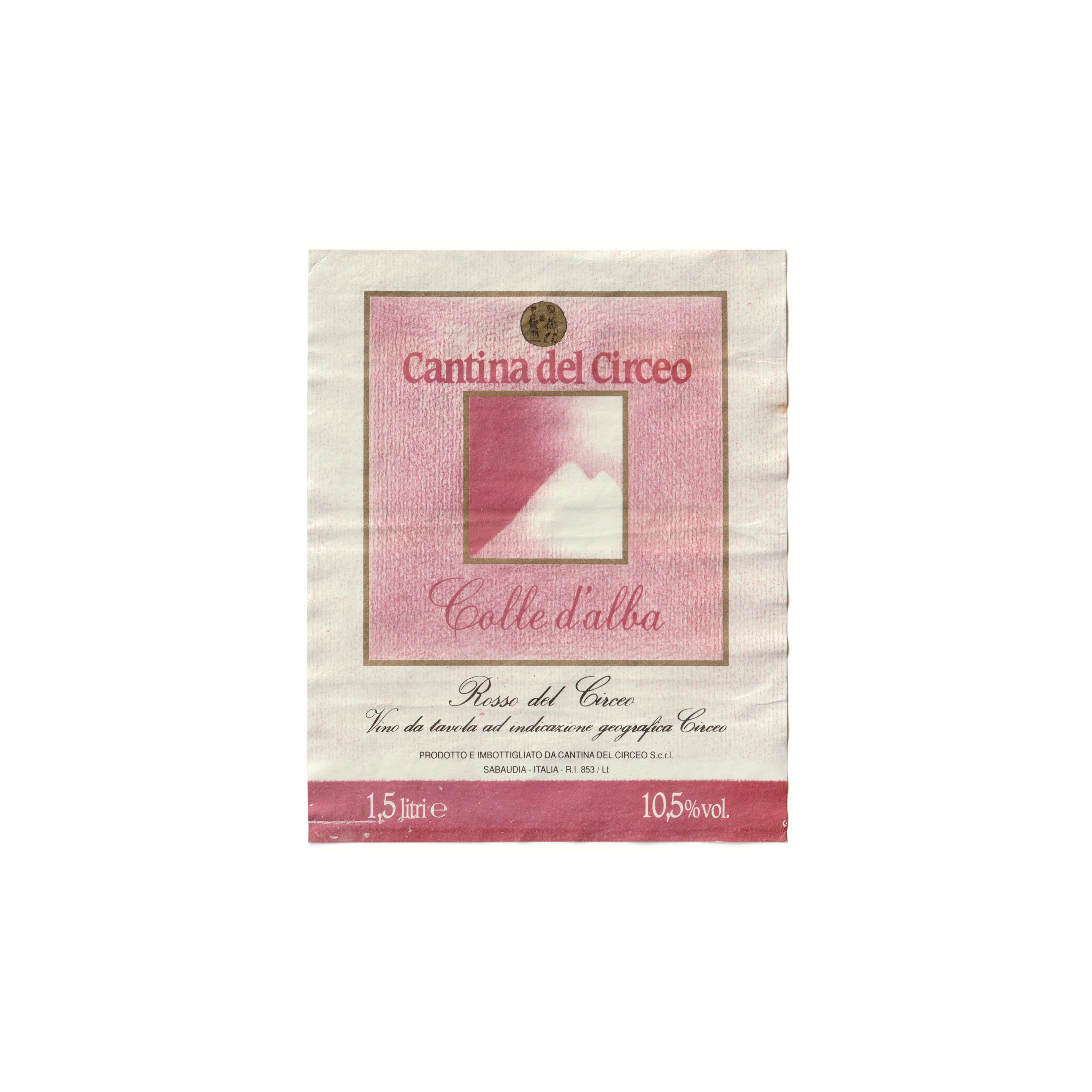 Il vino rosso Colle d’Alba, prodotto a Sabaudia, in Italia, presenta un’etichetta rettangolare realizzata in carta patinata opaca e stampata con tecnologia Offset.