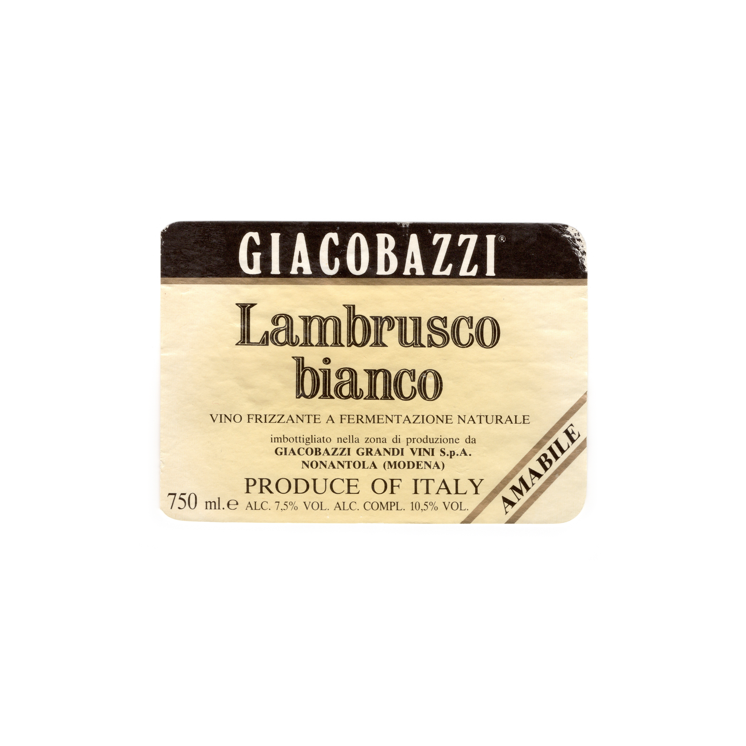 Il vino bianco Lambrusco Bianco, prodotto a Nonantola, in Italia, presenta un’etichetta rettangolare realizzata in carta patinata opaca e stampata con tecnologia offset.