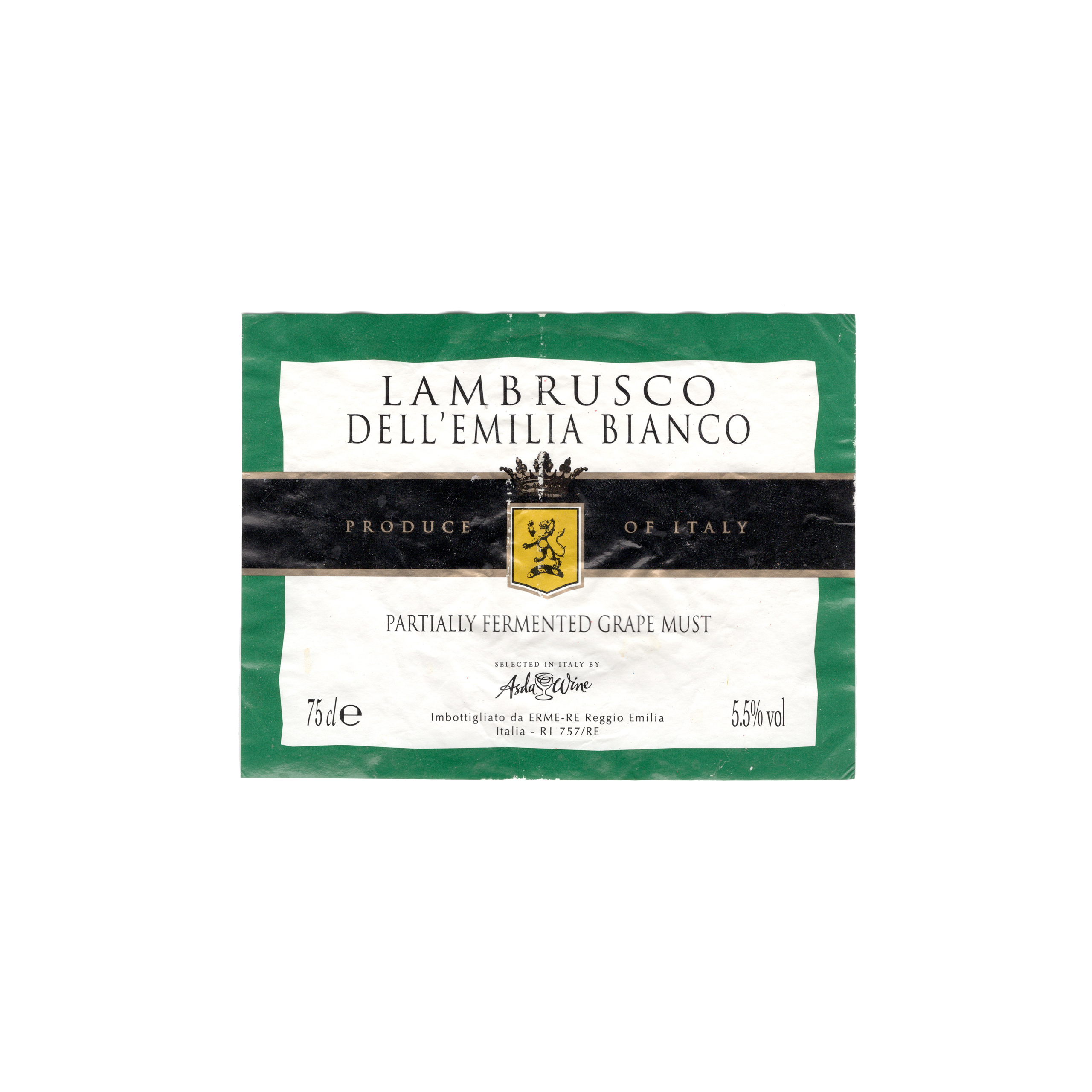 Il vino bianco Lambrusco dell’Emilia Bianco, prodotto a N/A, in Italia, presenta un’etichetta rettangolare realizzata in carta patinata lucida e stampata con tecnologia offset.