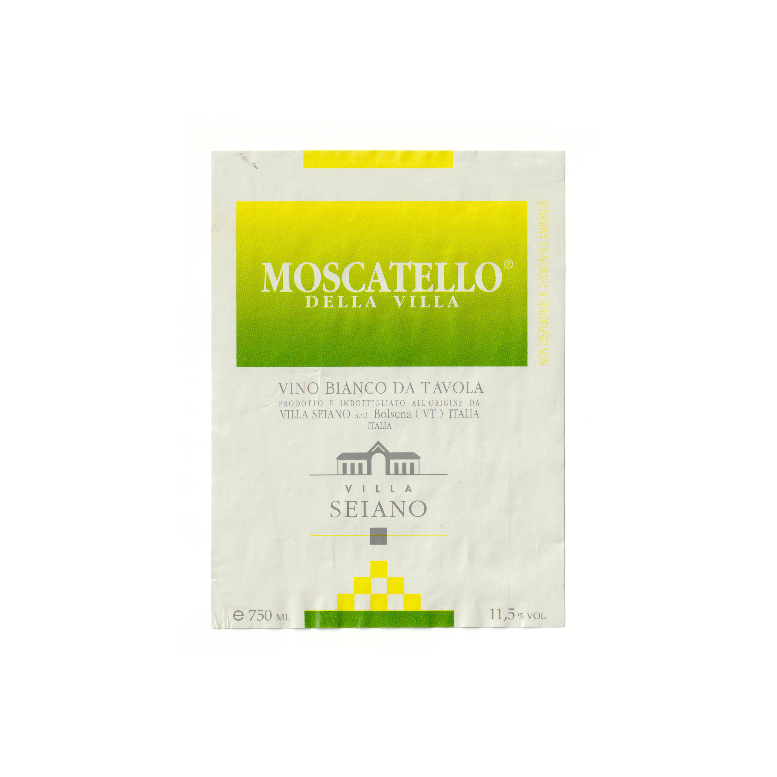 Il vino bianco Moscatello della Villa, prodotto a Bolsena, in Italia, presenta un’etichetta rettangolare realizzata in carta patinata lucida e stampata con tecnologia Offset.