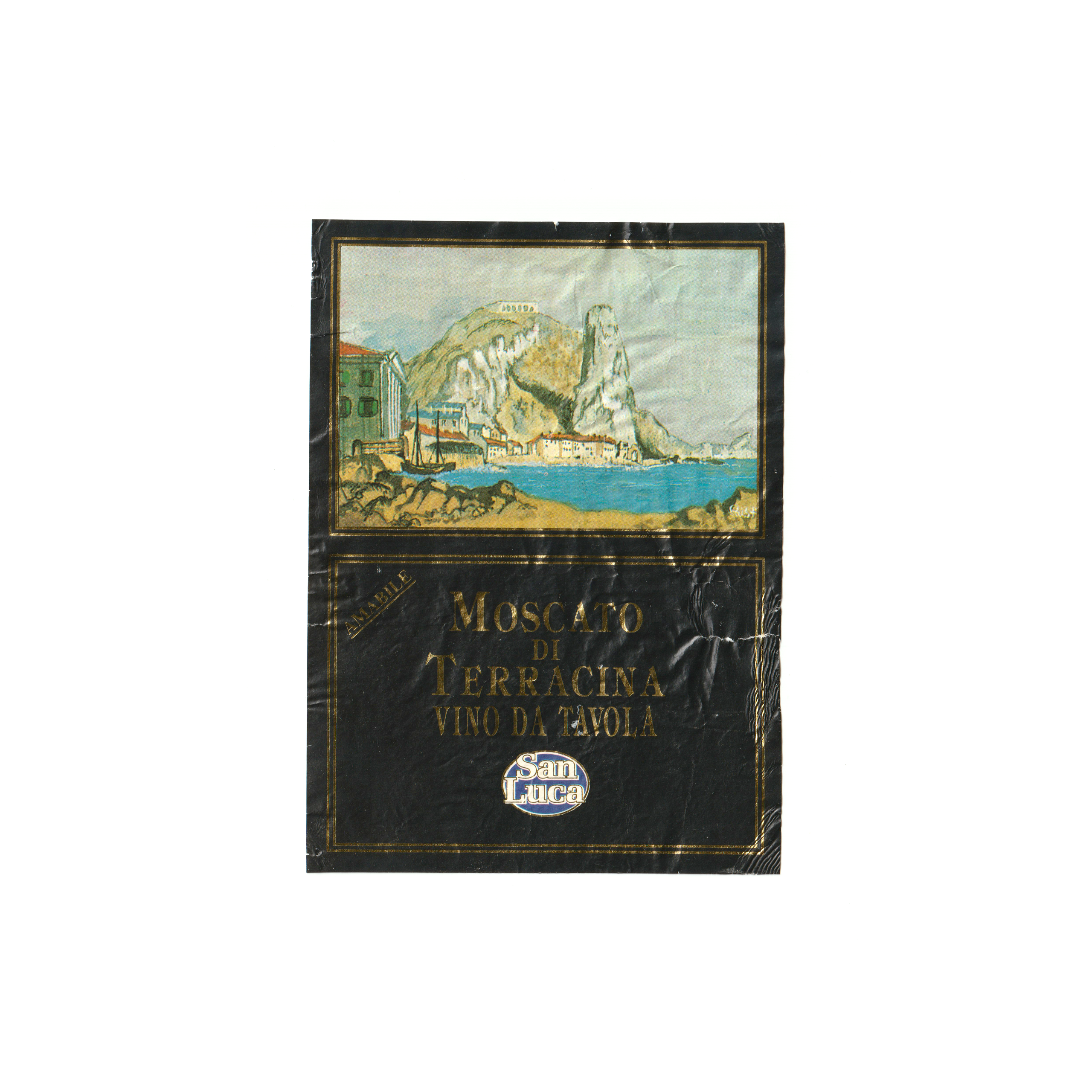 Il vino bianco Moscato di Terracina, prodotto a Cisterna di Latina, in Italia, presenta un’etichetta rettangolare realizzata in carta patinata opaca e stampata con tecnologia offset.