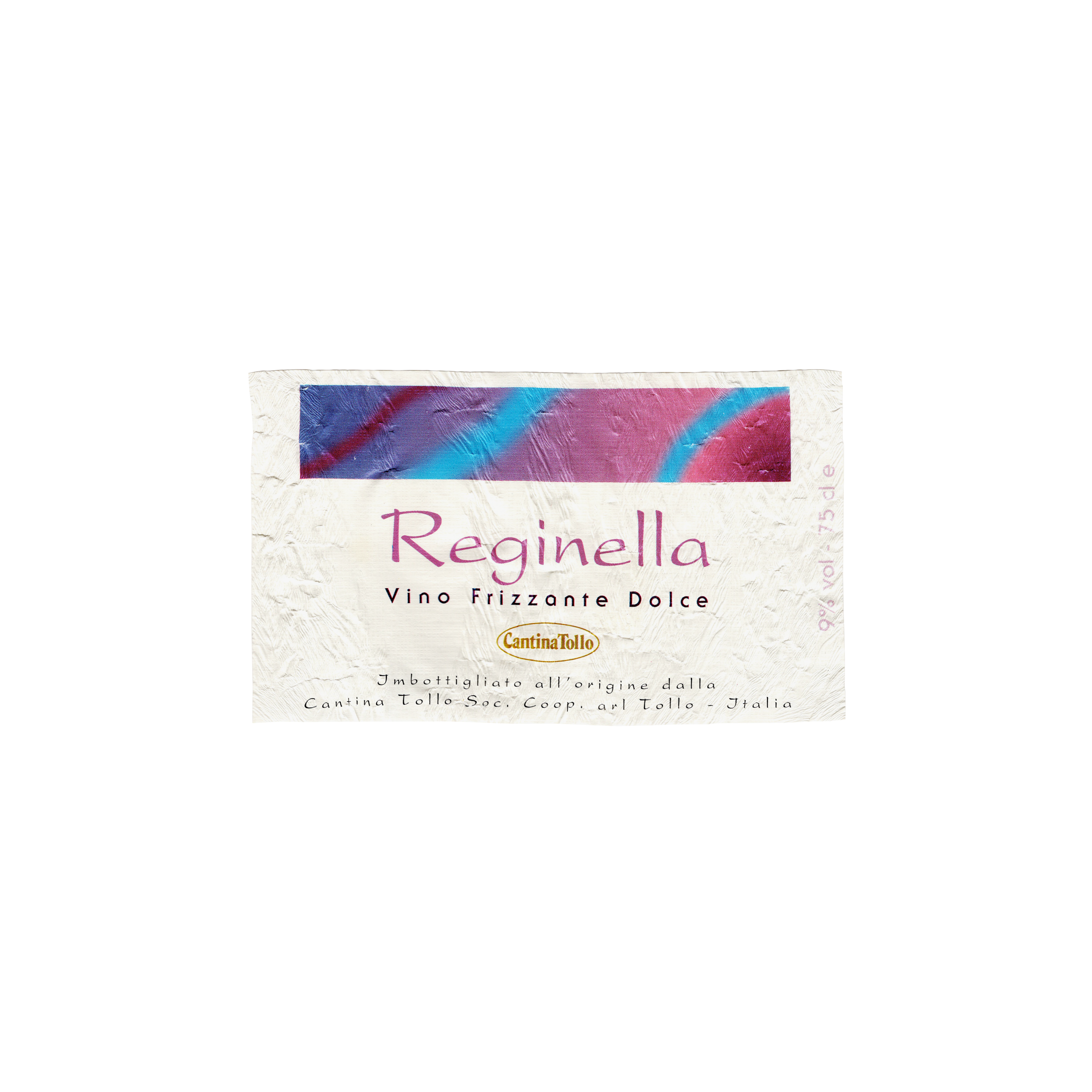 Il vino bianco Reginella, prodotto a N/A, in Italia, presenta un’etichetta rettangolare realizzata in carta patinata opaca e stampata con tecnologia offset.