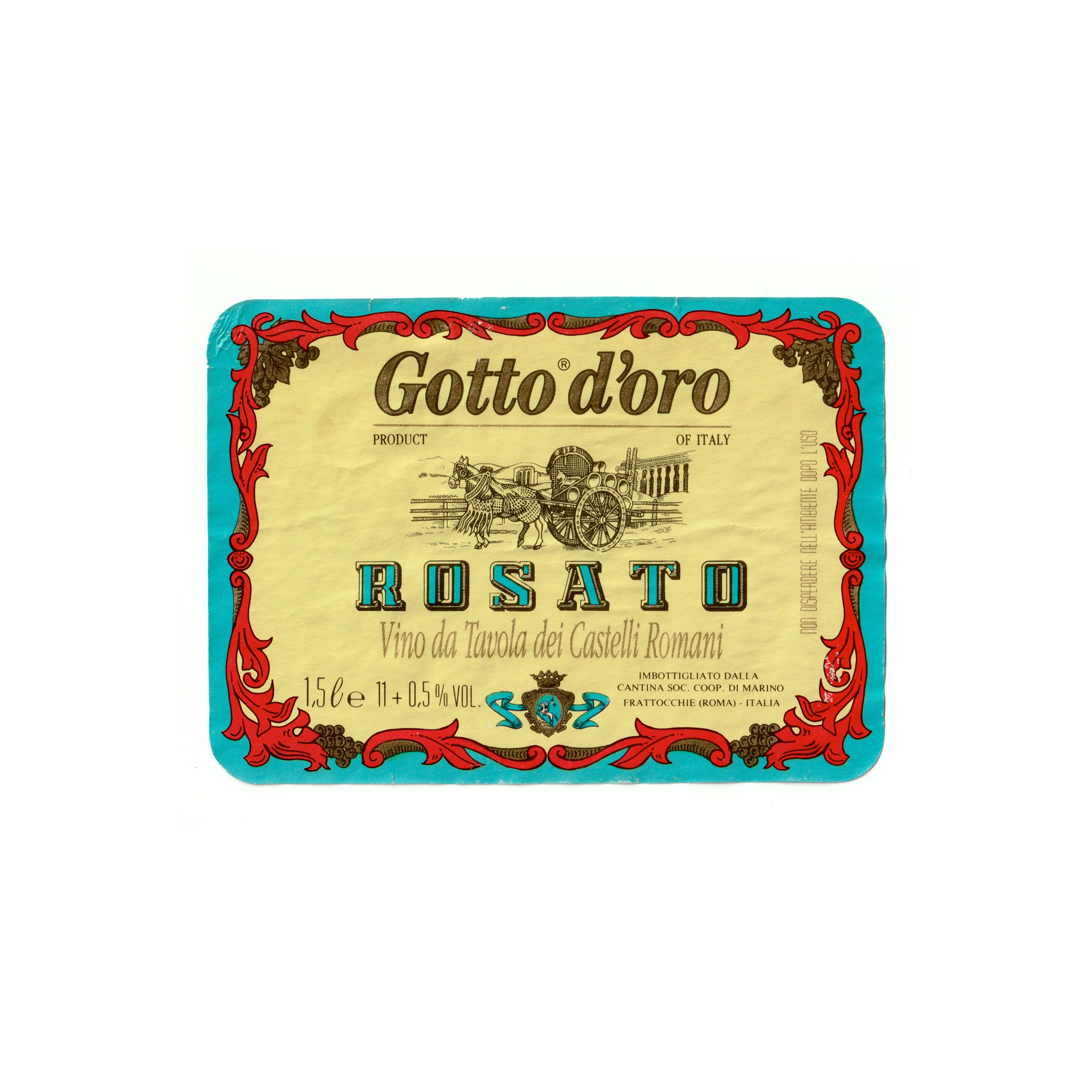 Il vino rosato Gotto d’oro Rosato, prodotto a Frattocchie, in Italia, presenta un’etichetta rettangolare realizzata in carta patinata lucida e stampata con tecnologia Offset.