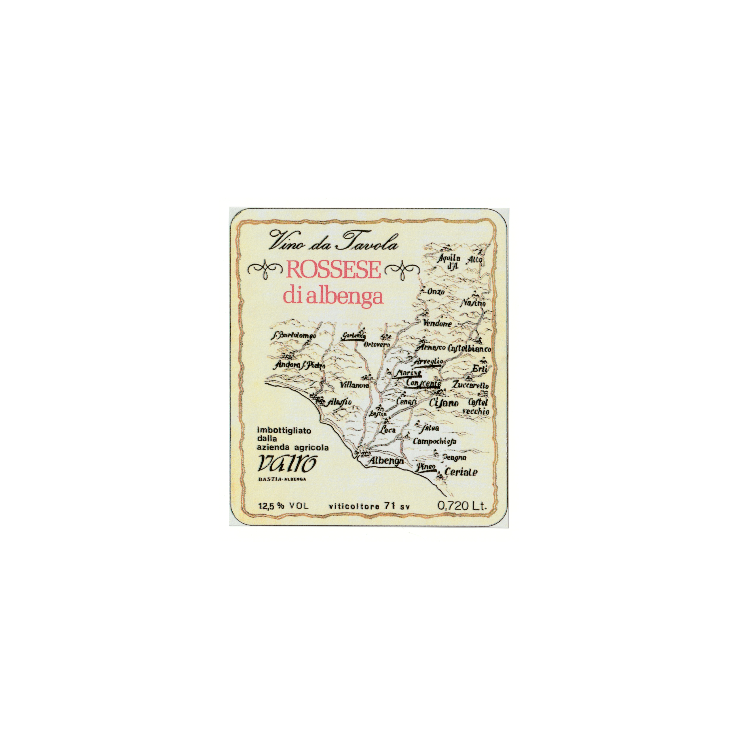 Il vino rosso Rossese di Albenga, prodotto a Bastia Dalbenga, in Italia, presenta un’etichetta rettangolare realizzata in carta usomano e stampata con tecnologia Digitale.