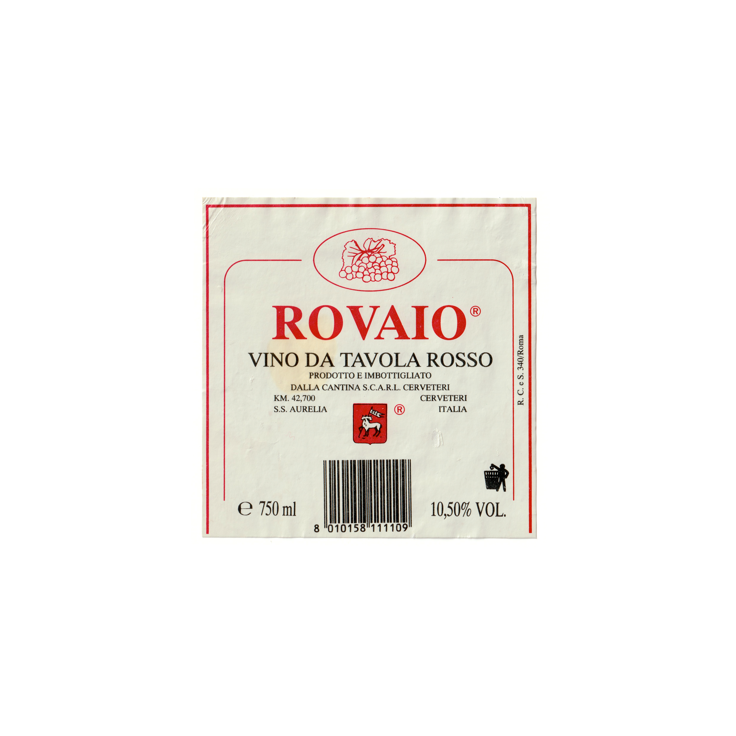 Il vino rosso Rovaio, prodotto a Cerveteri, in Italia, presenta un’etichetta quadrata realizzata in carta patinata lucida e stampata con tecnologia Offset.