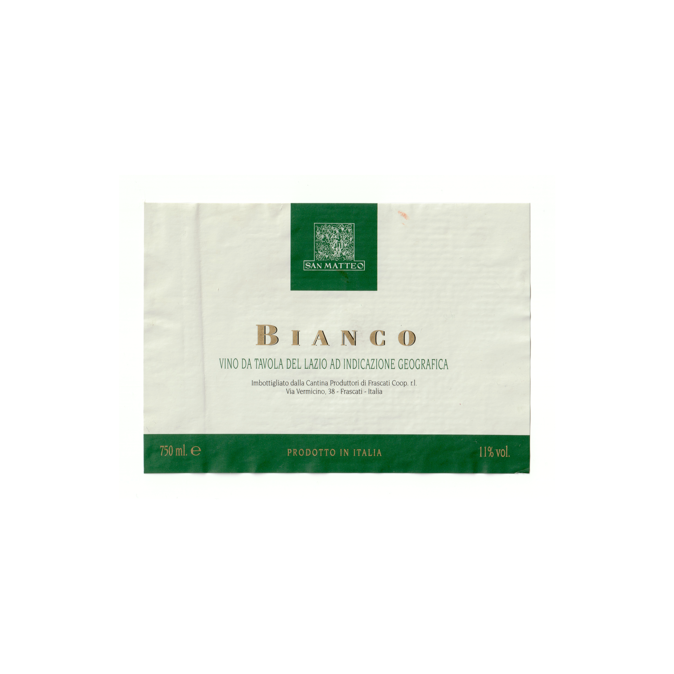 Il vino bianco San Matteo, prodotto a Frascati, in Italia, presenta un’etichetta rettangolare realizzata in carta marcata e stampata con tecnologia offset.