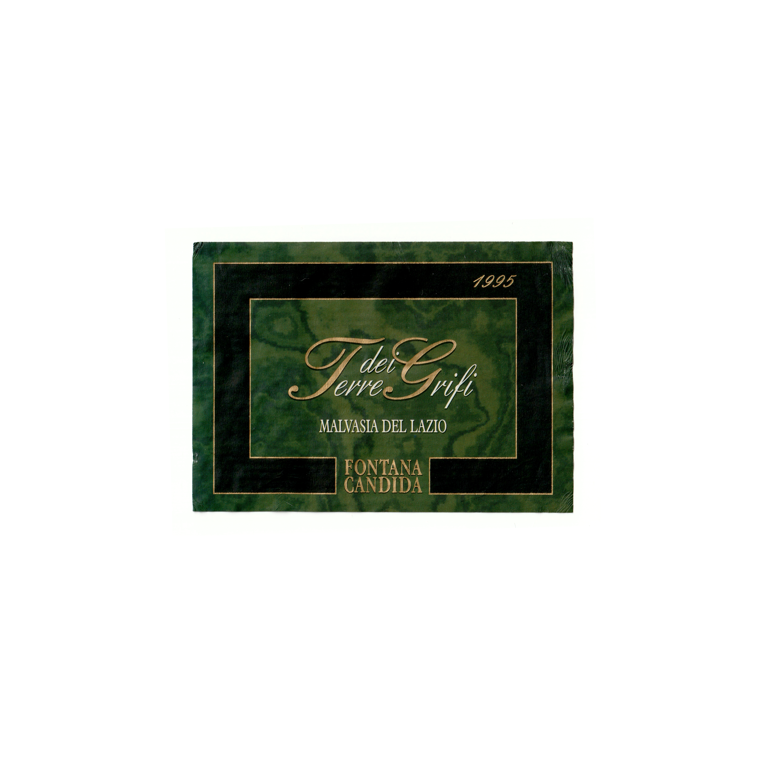 Il vino bianco Terre dei Grifi, prodotto a Monteporzio Catone, in Italia, presenta un’etichetta rettangolare realizzata in carta usomano e stampata con tecnologia Offset.