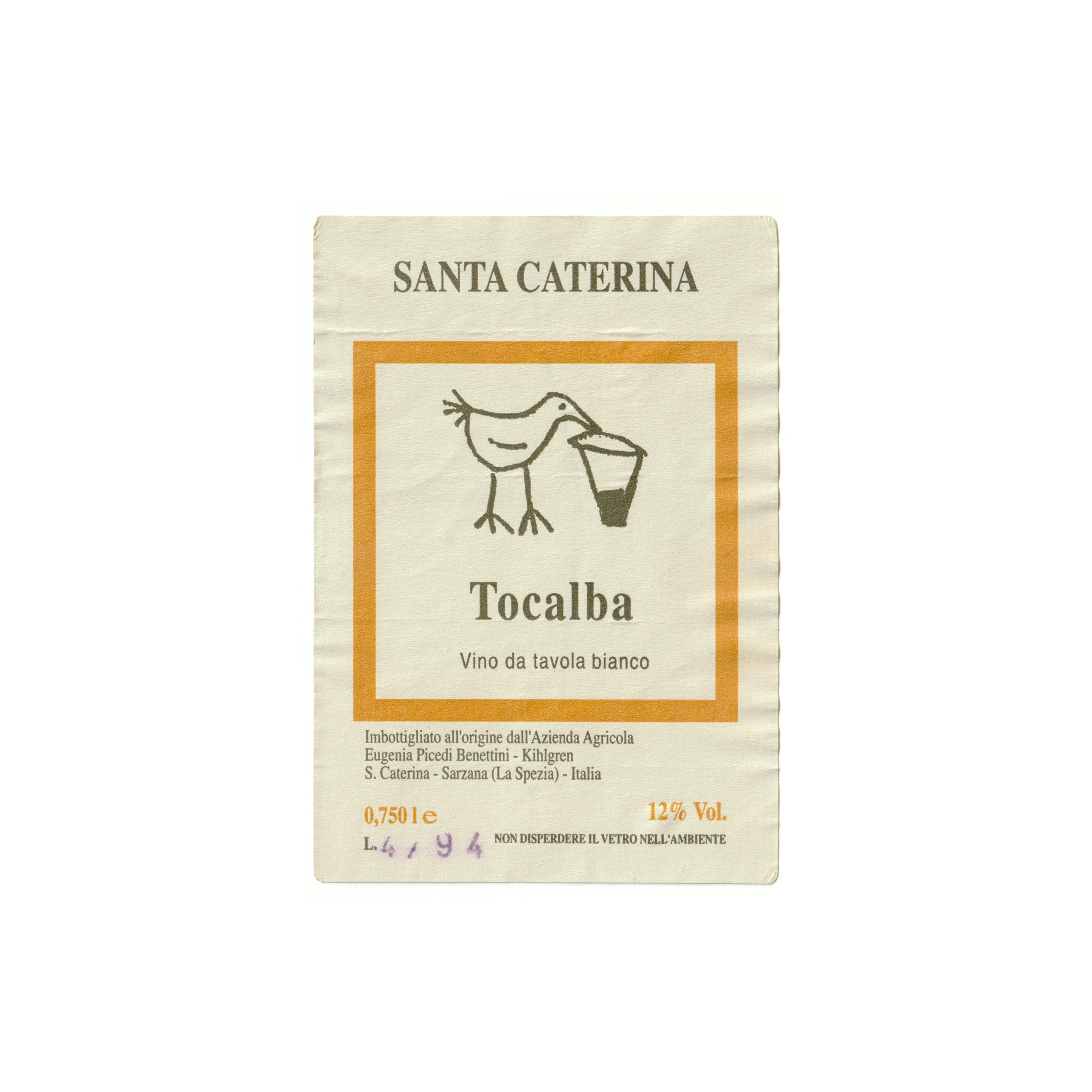Il vino bianco Tocalba, prodotto a Sarzana, in Italia, presenta un’etichetta rettangolare realizzata in carta marcata e stampata con tecnologia Offset.