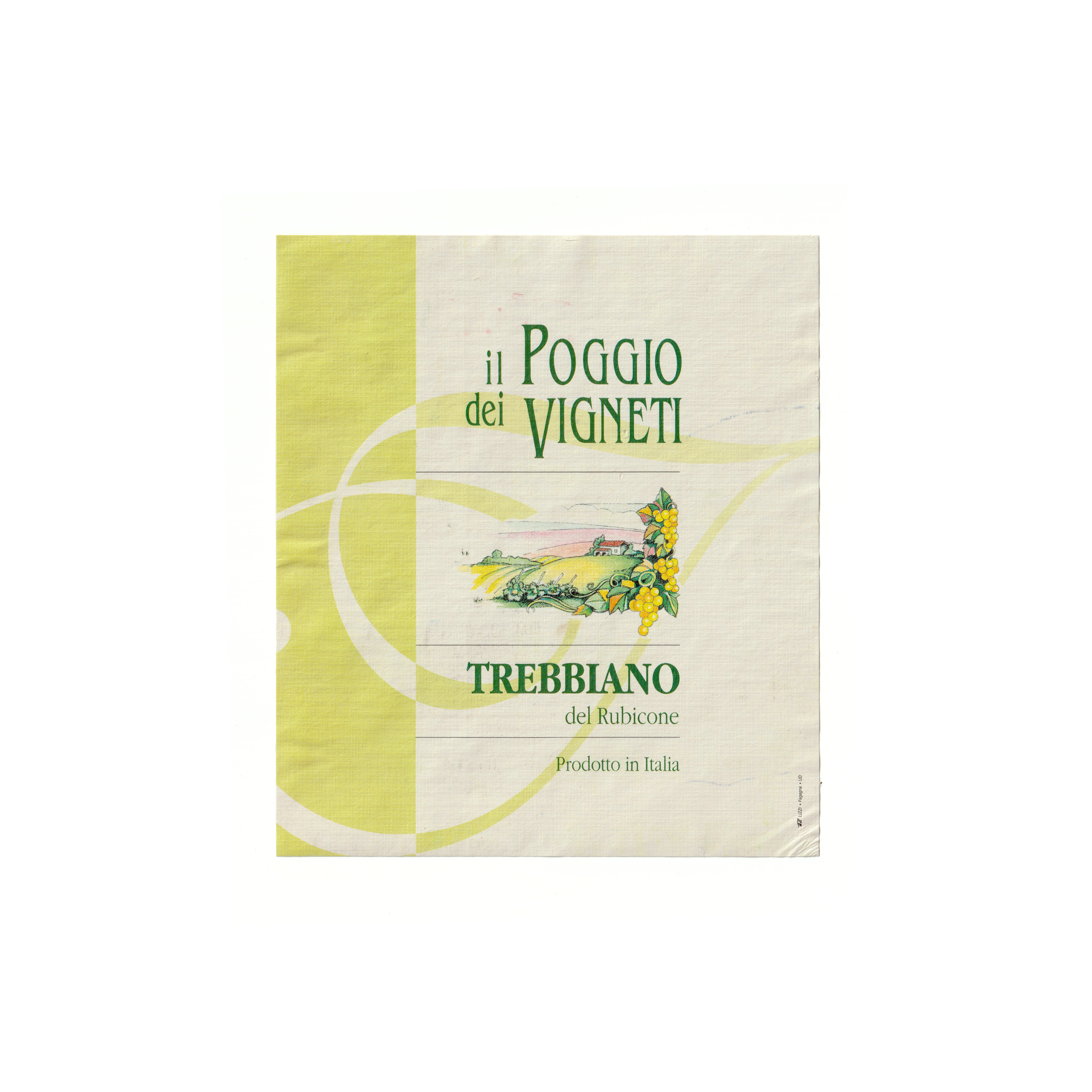 Il vino bianco Trebbiano del Rubicone, prodotto a Cermenate, in Italia, presenta un’etichetta rettangolare realizzata in carta marcata e stampata con tecnologia Offset.