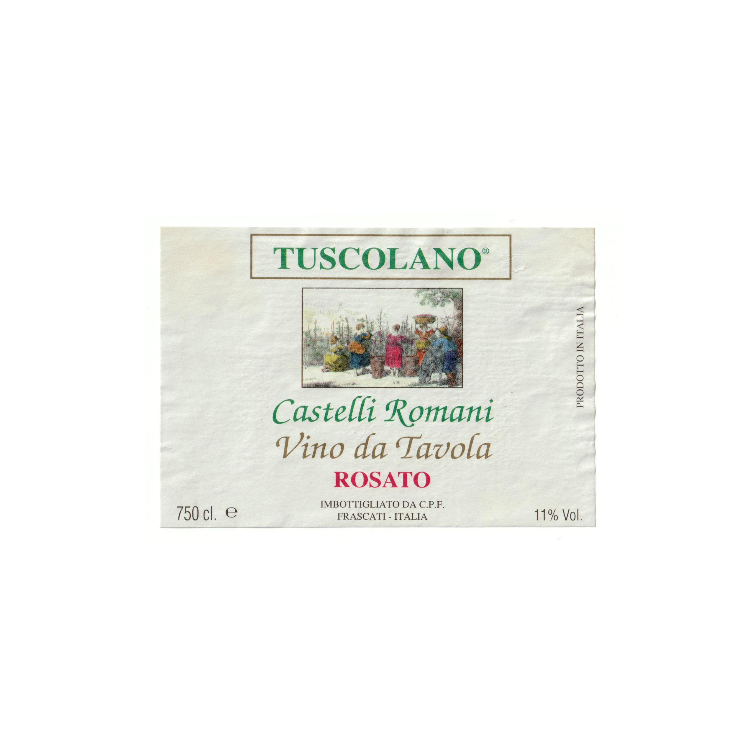 Il vino rosato Tuscolano – Castelli Romani, prodotto a Frascati, in Italia, presenta un’etichetta rettangolare realizzata in carta usomano e stampata con tecnologia Offset.