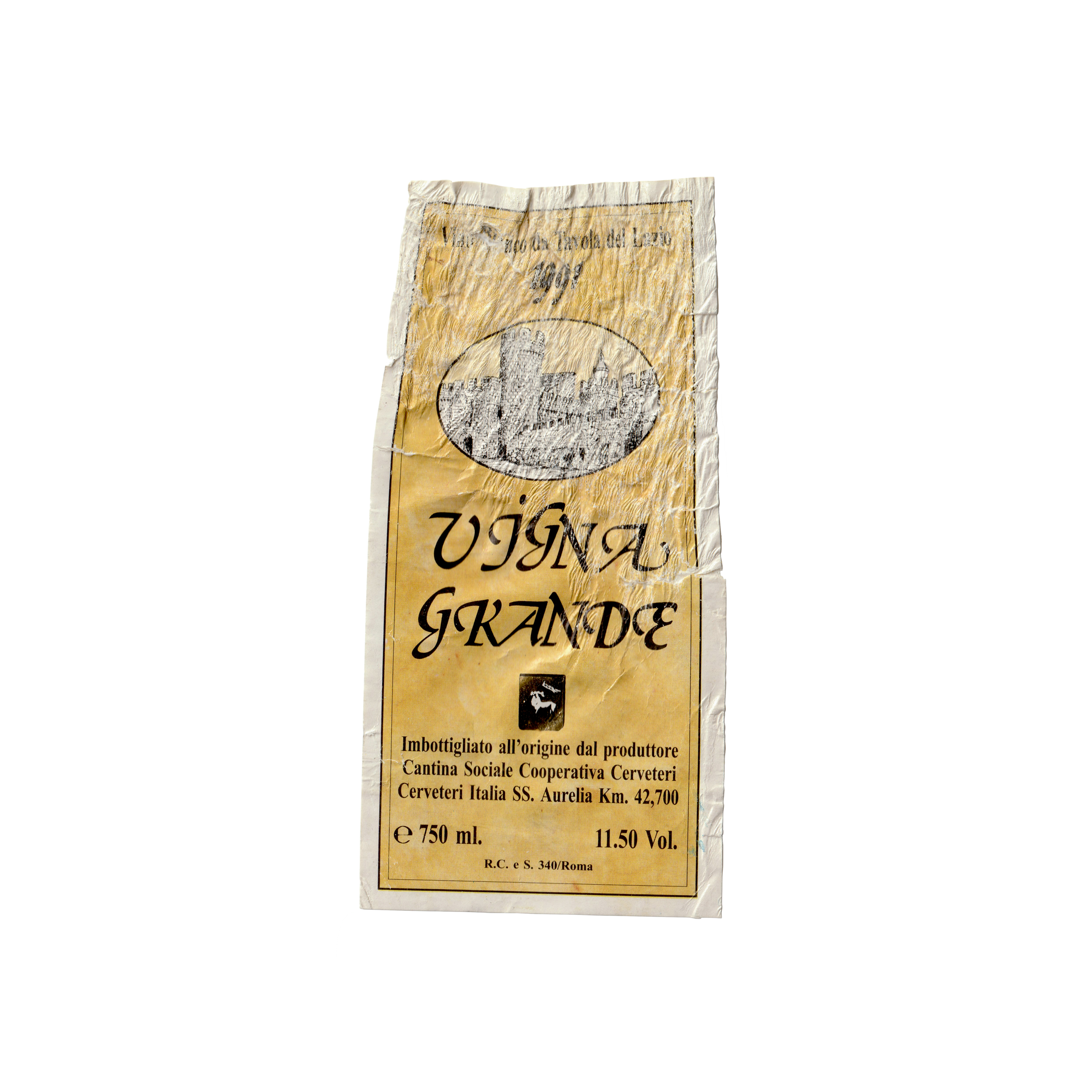 Il vino bianco Vigna Grande, prodotto a Cerveteri, in Italia, presenta un’etichetta rettangolare realizzata in carta patinata lucida e stampata con tecnologia Offset.
