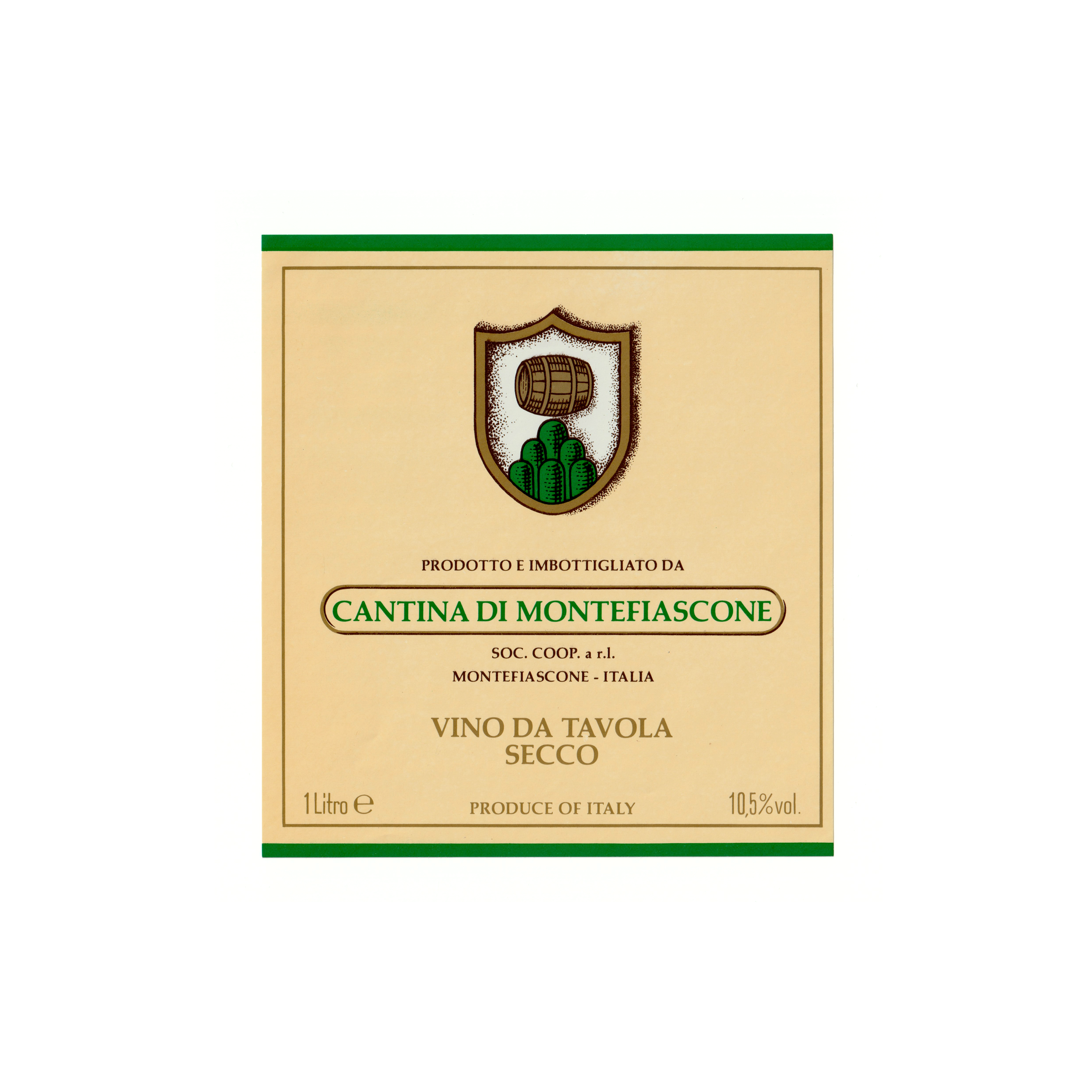 Il vino bianco Vino da tavola secco, prodotto a Montefiascone, in Italia, presenta un’etichetta rettangolare realizzata in carta patinata lucida e stampata con tecnologia Offset.